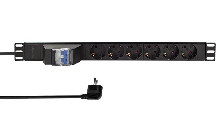 Steckdosenleiste 1 HE 6-fach Schuko 2-pol. Schutzschalter 19'' Rack einbaufähig, 45°-Anordnung, Schwarz, max. 16 A